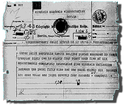 Eddington first observed the bending of light by a gravitational field in 1919, during a solar eclipse. This was the first new effect to be observed that had been predicted by General Relativity. The telegram reproduced below reports the observations made on a subsequent eclipse in 1922.