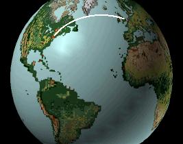 The shortest distance between two points on the Earth is a curved line, since the surface of the Earth is a curved surface, a sphere. So, to travel from New York to London, you must fly significantly north of either one to take the shortest path: